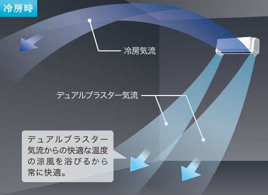 「涼感アップモード」は、斜め下に向けた「デュアルブラスター」の室温気流で、より涼感が高まります。