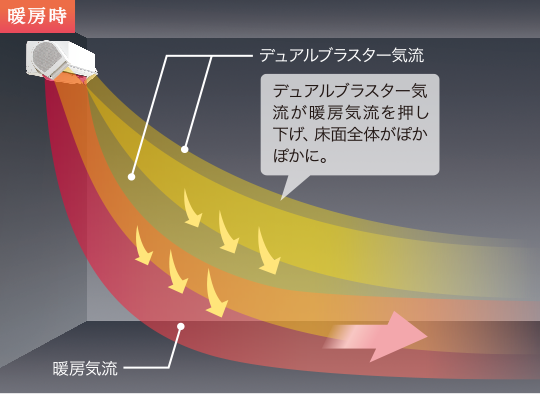 運転開始時、「デュアルブラスター」の気流が冷気を撹拌し、部屋中に行き渡らせます(両モード共通)