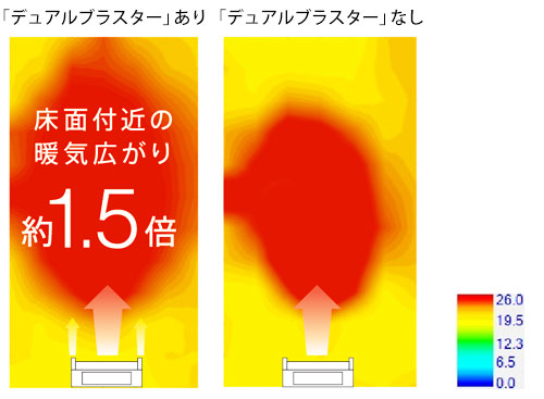 - 当社環境試験室14畳、外気温7℃、設定温度24℃、風量自動、上下風向暖房標準、左右風向正面、「デュアルブラスター」気流あり、暖房運転安定時。床上10㎝の温度分布を計測。設定温度(24℃)以上のエリア(「デュアルブラスター」あり14㎡、「デュアルブラスター」なし9㎡)の比較。効果は使用環境により異なる場合があります。