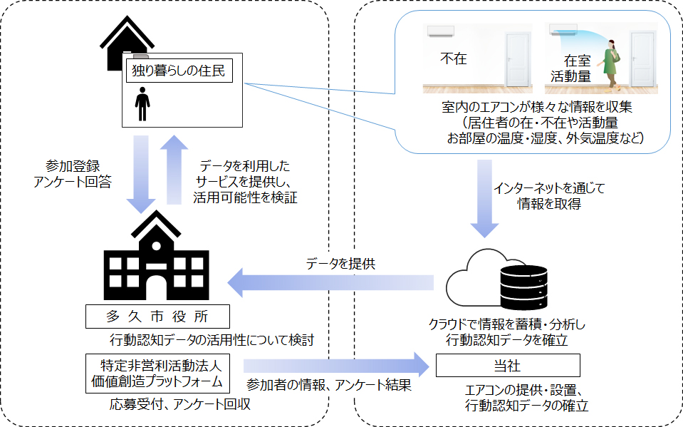 実証実験は、佐賀県多久市の住民を対象に、当社がエアコンを提供・設置し、データの収集を行います。なお、参加者の募集やアンケートの回収は、NPO 法人価値創造プラットフォームが行います。