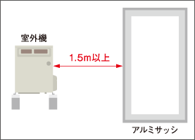 塗装アルミサッシの窓や出窓の下には、1.5m以上の距離をとって設置してください。排気ガスにより、アルミサッシの塗装を痛めたり、変色させる恐れがありますのでご注意ください。