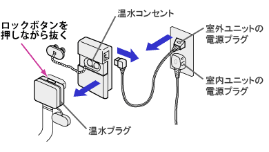 温水プラグはロックボタンを押しながら、温水コンセントから抜いてください。