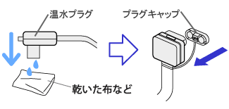 - 温水プラグから少量の水滴が落ちますので、乾いた布などを下側にあててください。