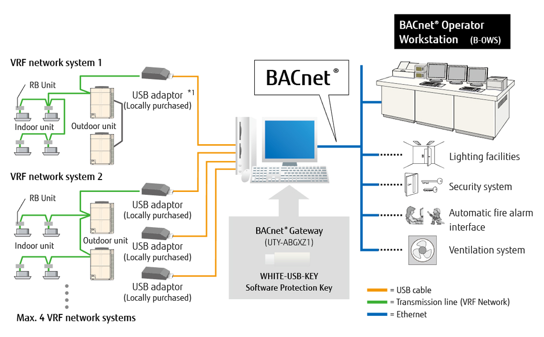 - Średni i duży BMS można podłączyć do systemu sieciowego VRF za pośrednictwem BACnet®, standardowego protokołu komunikacyjnego dla otwartych sieci.