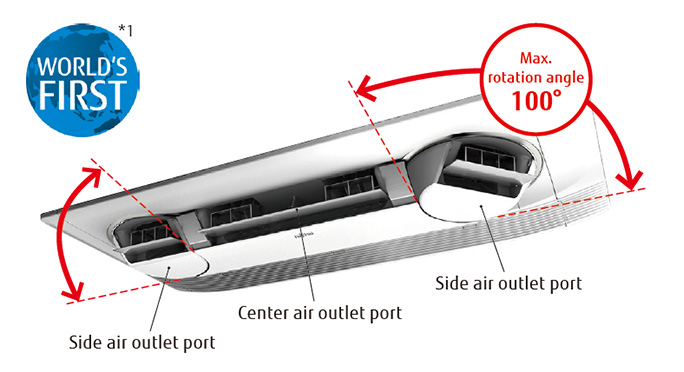 Komfortowe ustawienie przepływu powietrza umożliwia działanie prawego i lewego otworu wylotowego powietrza oraz szerokiego otworu środkowego w celu zapewnienia komfortu w pomieszczeniu.