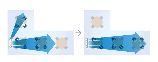Strumień powietrza jest sterowany w optymalny sposób, aby zapewnić wyższy komfort w wąskim pomieszczeniu.