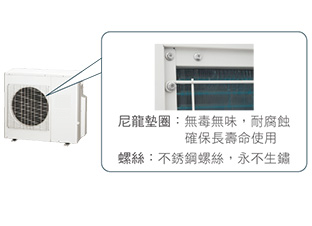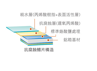 台灣靠近沿海、硫磺等地區的居家環境,以及由居家排水溝向上蒸發的沼氣,容易導致空調室外機受腐蝕、氧化,以致減少使用壽命。富士通VRF的室外機,特別在一般鋁製鰭片上塗一層壓克力樹脂和親水膜,使其具有一定的抗蝕能力,延長產品使用壽命。
