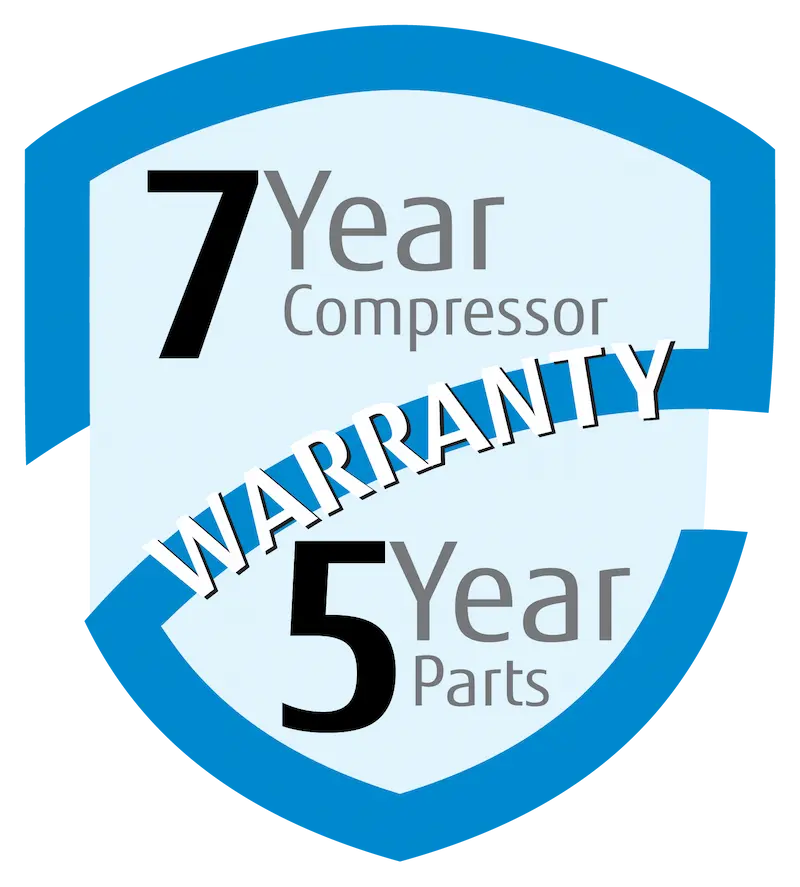 7 Year Compressor, 5 Year Parts out-of-the-box Warranty.